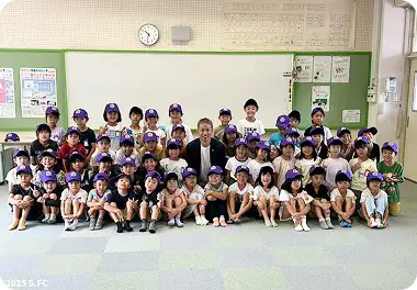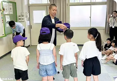 7⽉1⽇には森﨑浩司さんが府中北⼩学校を訪れ、贈呈式が⾏われました。